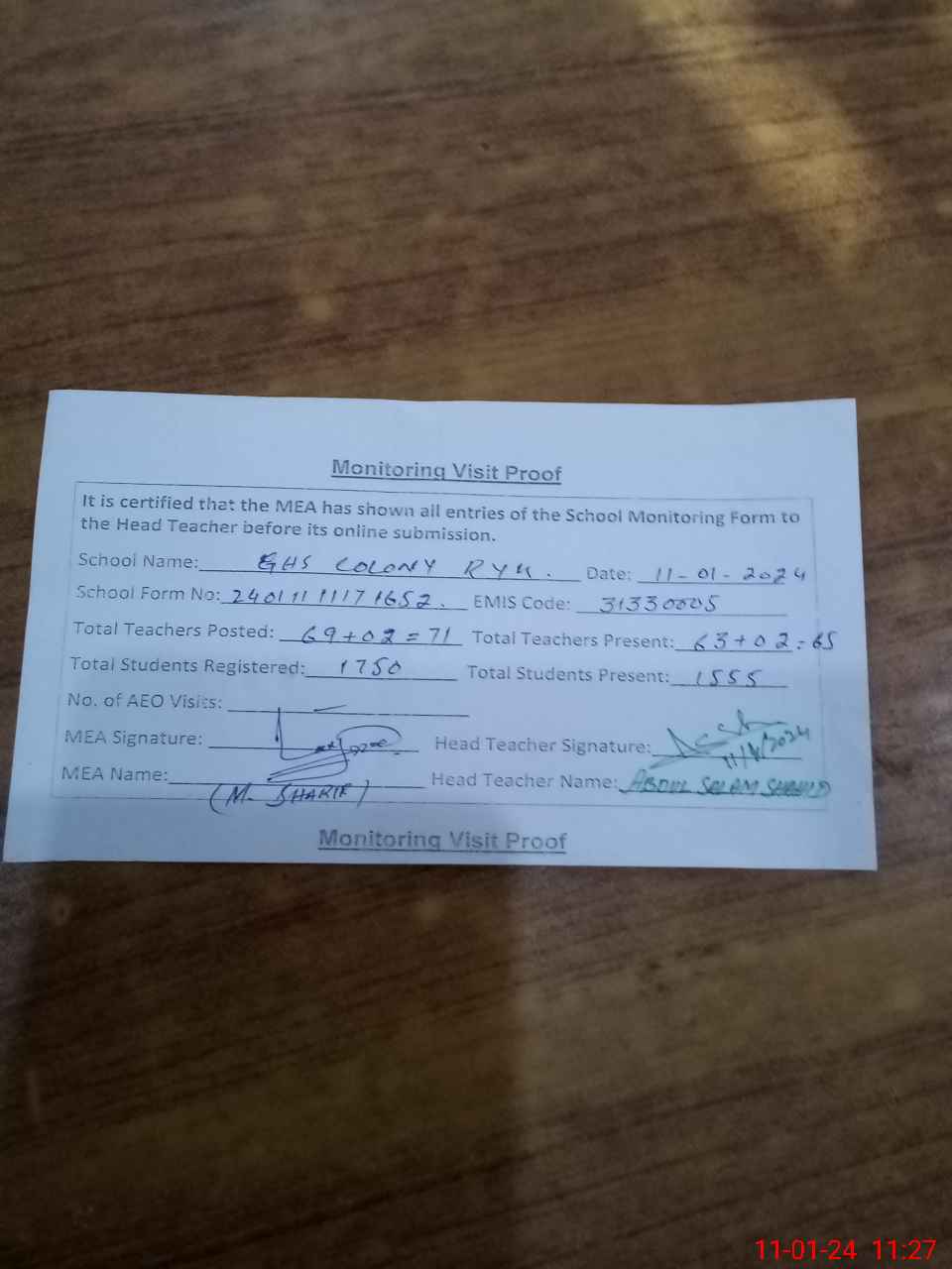 | Attendance Register | Head Teacher | MEA with School | Visit Proof |