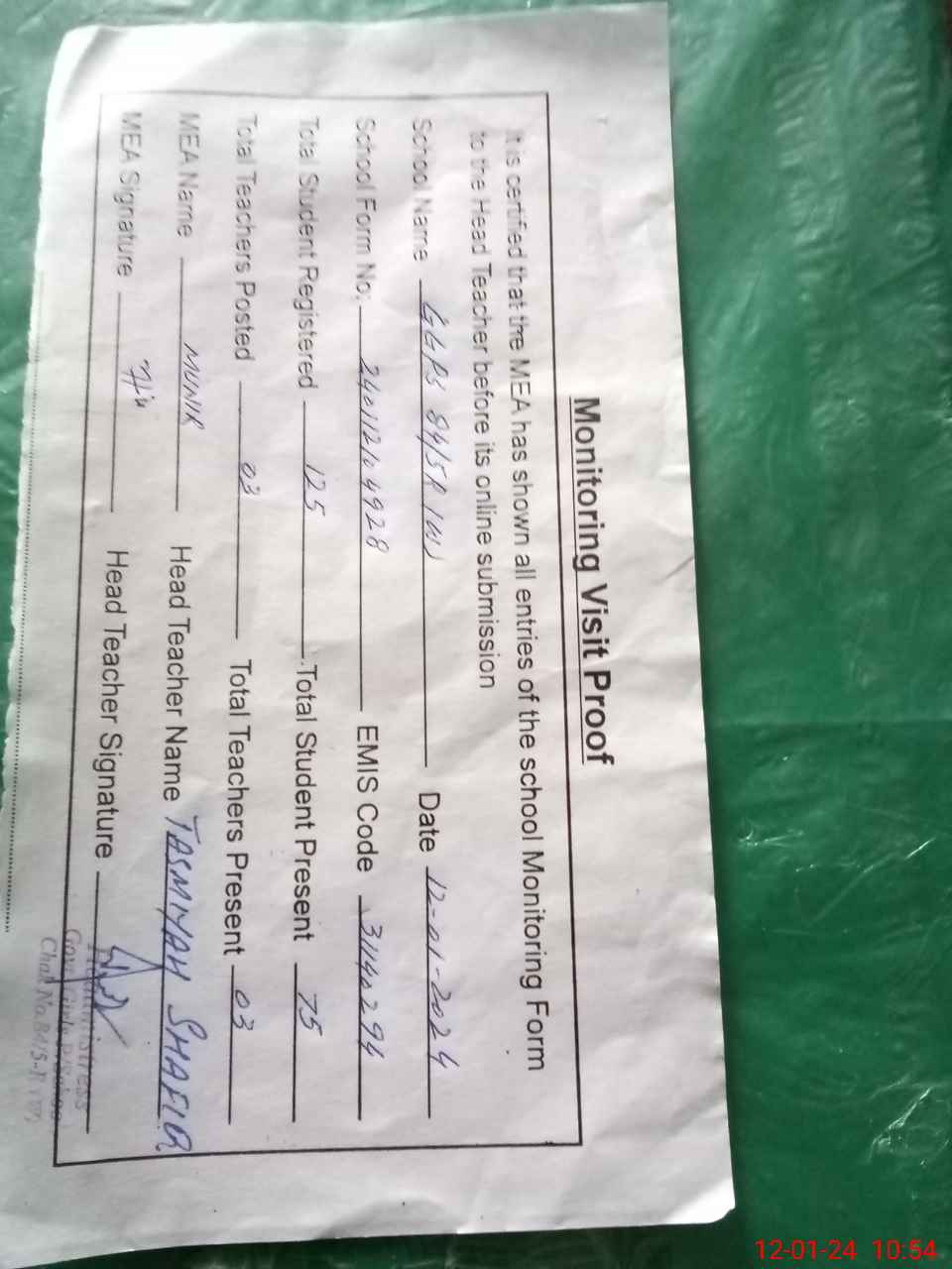 | Attendance Register | Head Teacher | MEA with School | Visit Proof |
