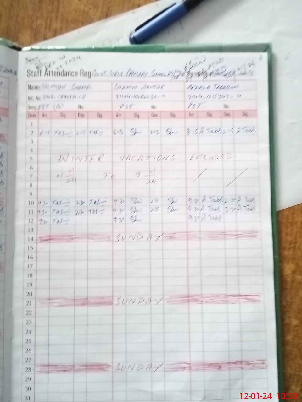 | CNIC | Full Name | Designation | R/C | Absence during last cal. month |