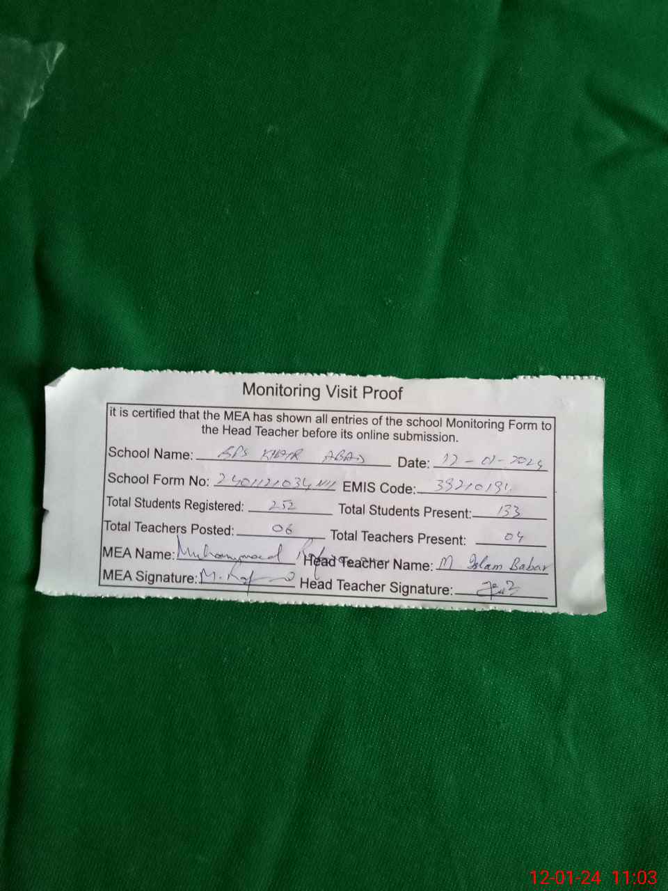 | Attendance Register | Head Teacher | MEA with School | Visit Proof |