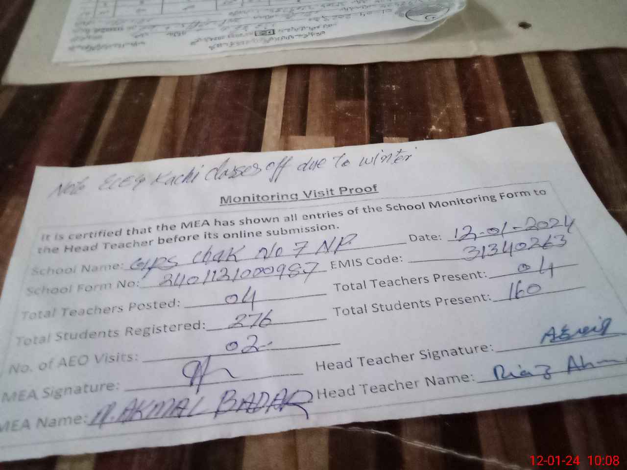 | Attendance Register | Head Teacher | MEA with School | Visit Proof |