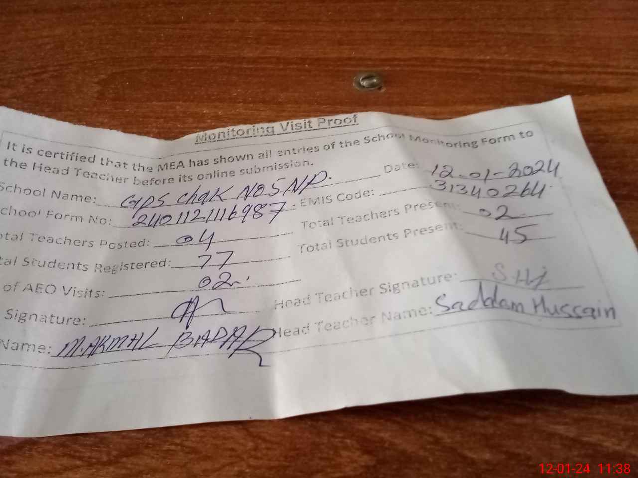 | Attendance Register | Head Teacher | MEA with School | Visit Proof |
