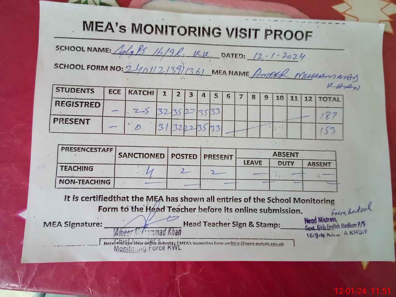 | Attendance Register | Head Teacher | MEA with School | Visit Proof |