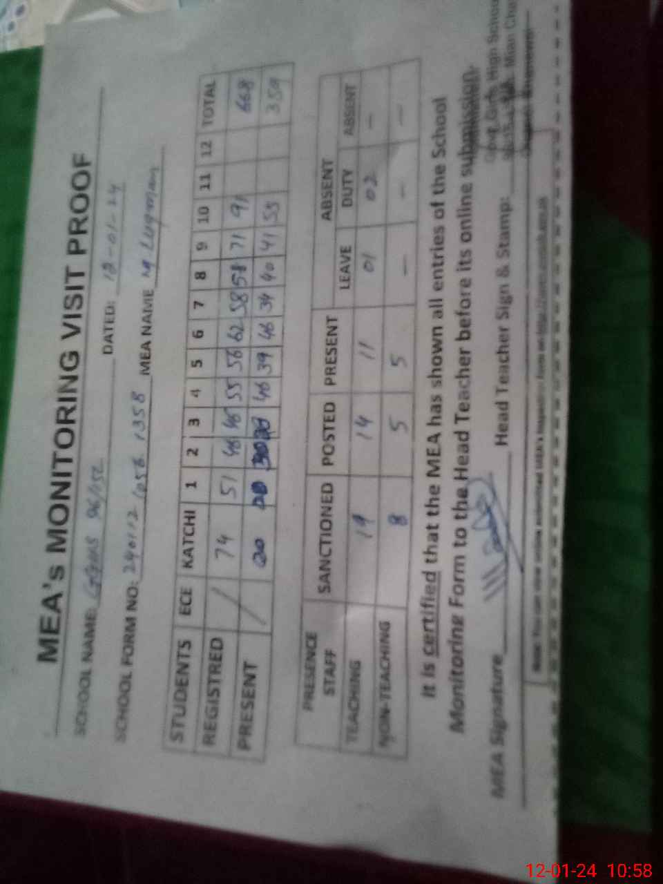 | Attendance Register | Head Teacher | MEA with School | Visit Proof |