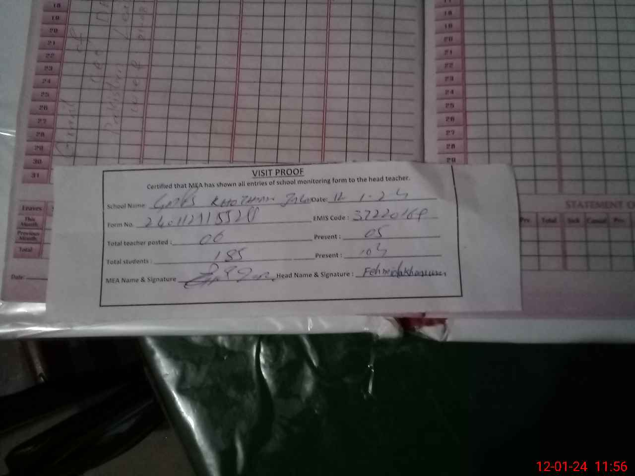 | Attendance Register | Head Teacher | MEA with School | Visit Proof |