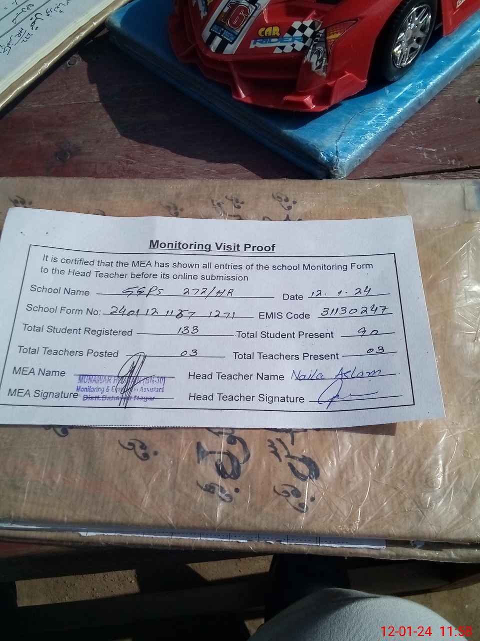 | Attendance Register | Head Teacher | MEA with School | Visit Proof |