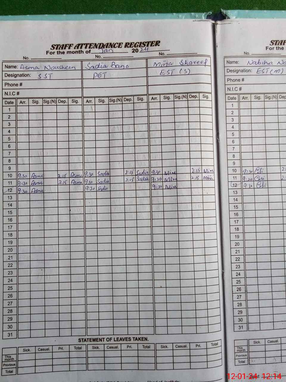 | CNIC | Full Name | Designation | R/C | Absence During Last Calender Month |