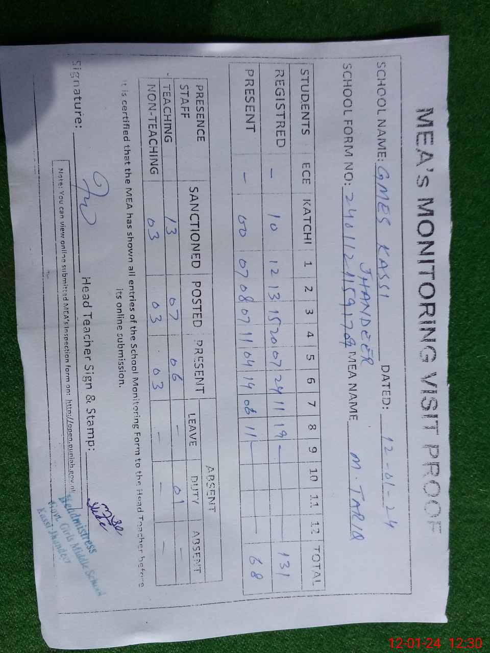 | Attendance Register | Head Teacher | MEA with School | Visit Proof |