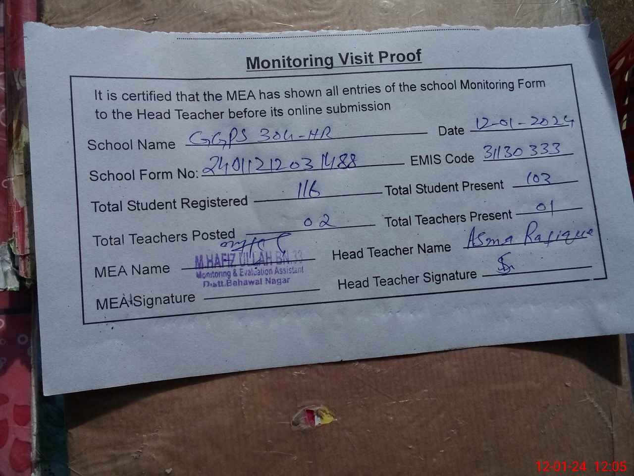 | EMIS Code: 31130333 | Name of School: GGPS CHAK NO 304 HR | |||