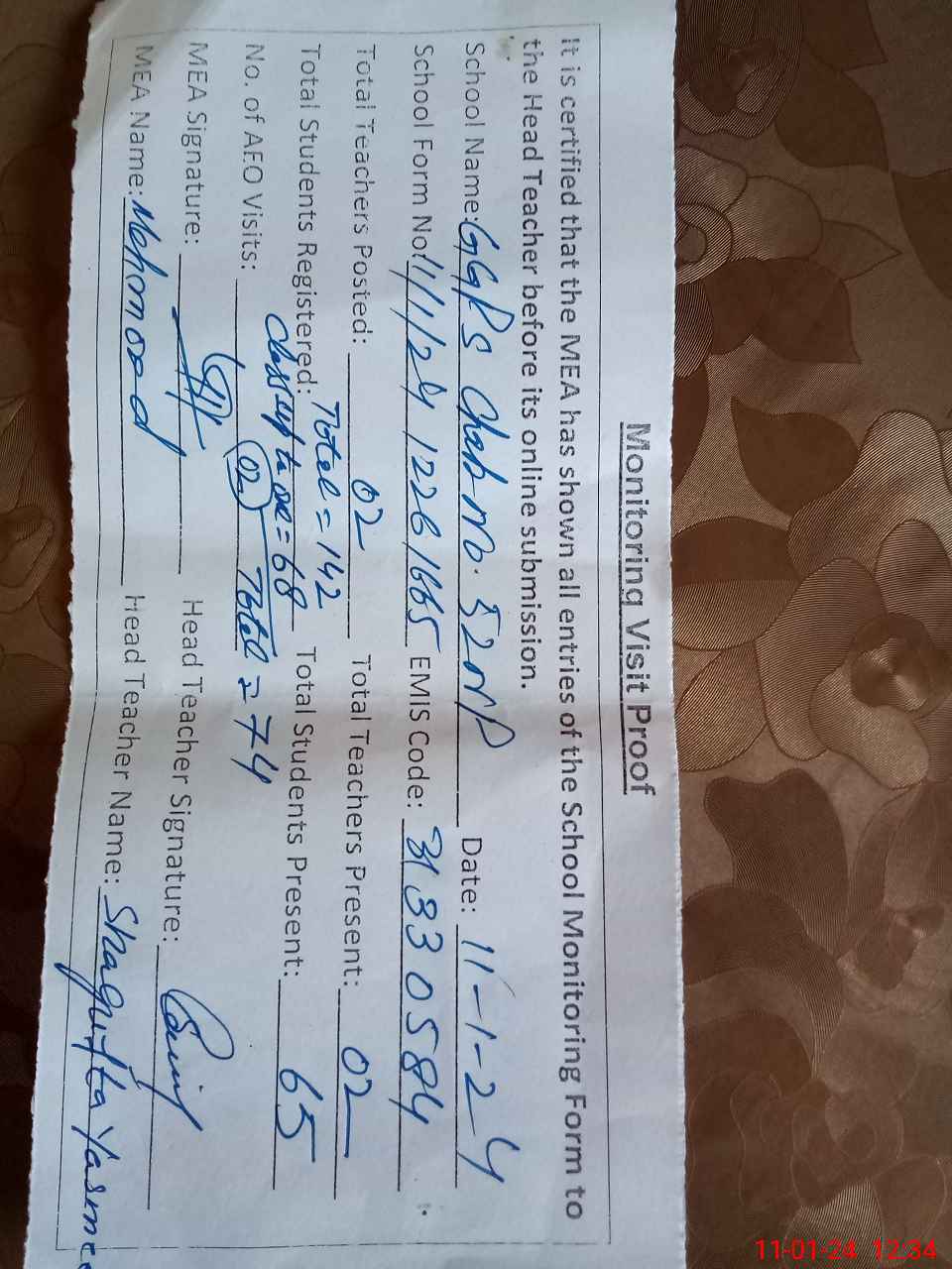 | Attendance Register | Head Teacher | MEA with School | Visit Proof |