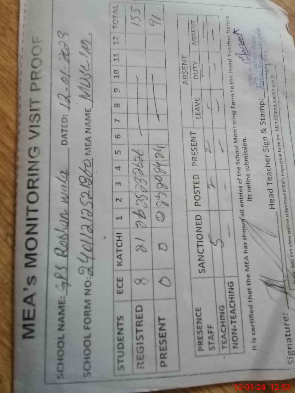 | Attendance Register | Head Teacher | MEA with School | Visit Proof |