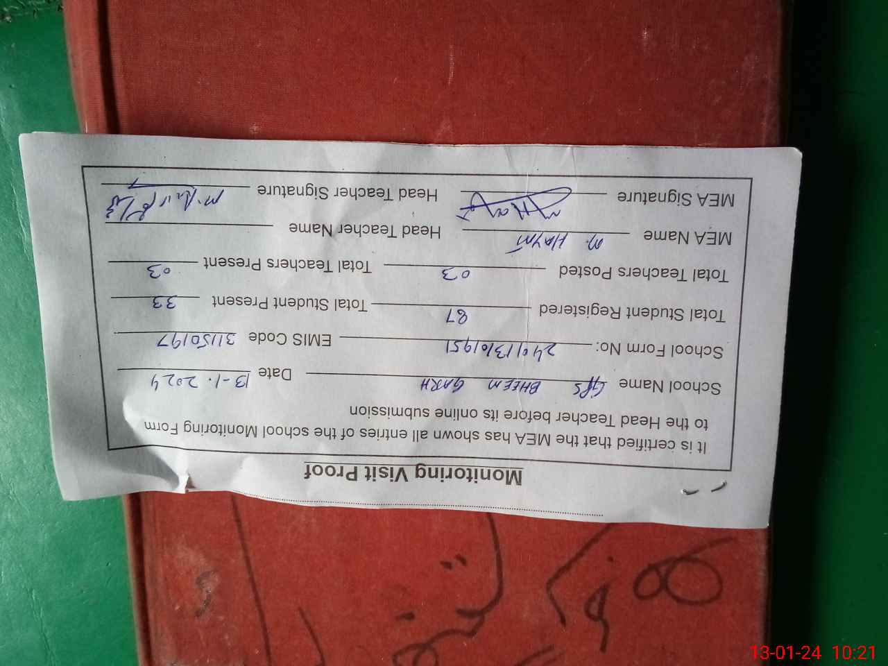 | Attendance Register | Head Teacher | MEA with School | Visit Proof |