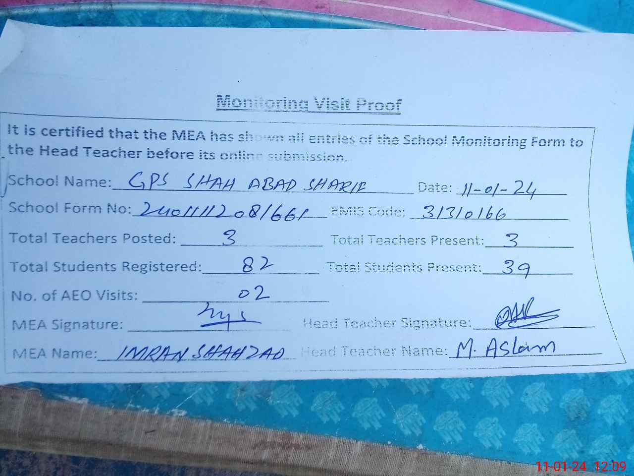 | EMIS Code: 31310166 | Name of School: GPS SHAH ABAD SHARIF | |||
