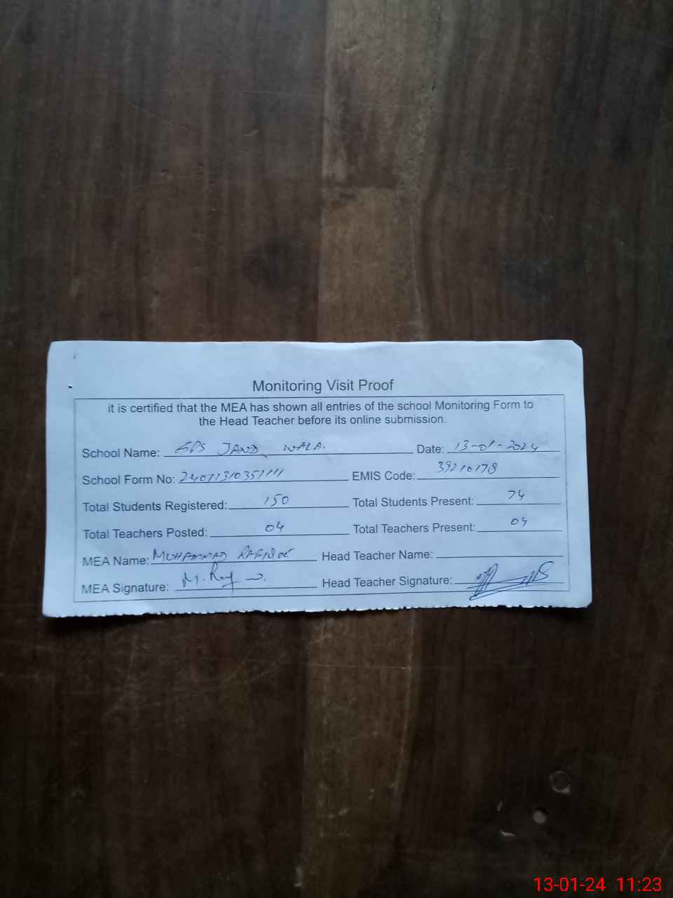 | Attendance Register | Head Teacher | MEA with School | Visit Proof |