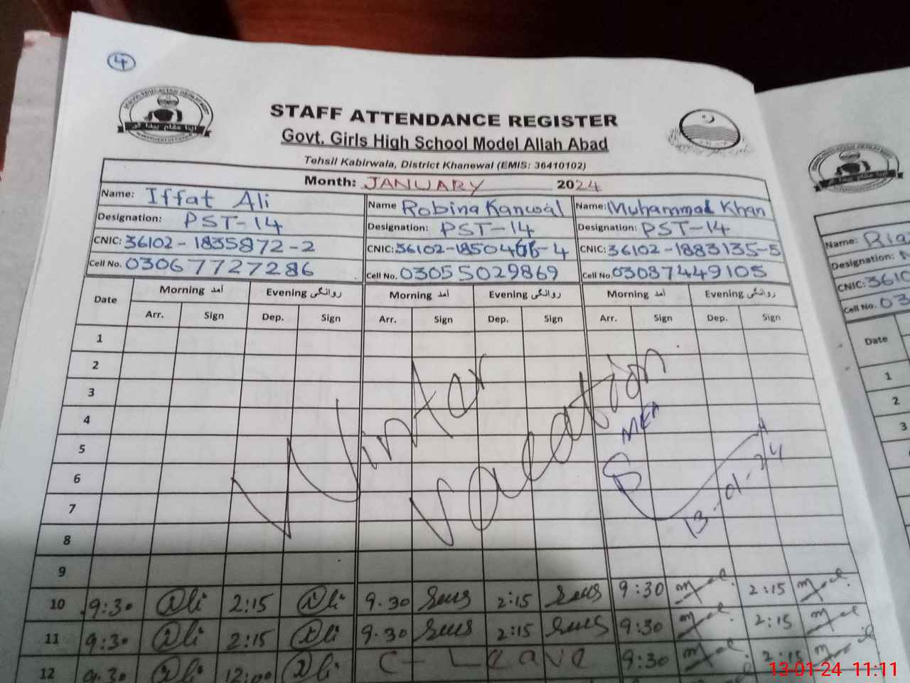 | CNIC | Full Name | Designation | R/C | Absence During Last Calender Month |