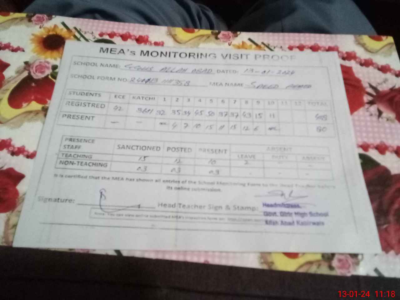 | Attendance Register | Head Teacher | MEA with School | Visit Proof |