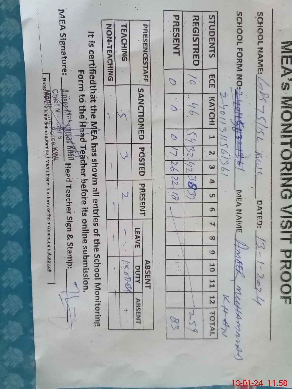 | Certified that this School was Inspected by the Undersigned MEA/DMO Today and the Information Stated Above is as Per Record. | |||||