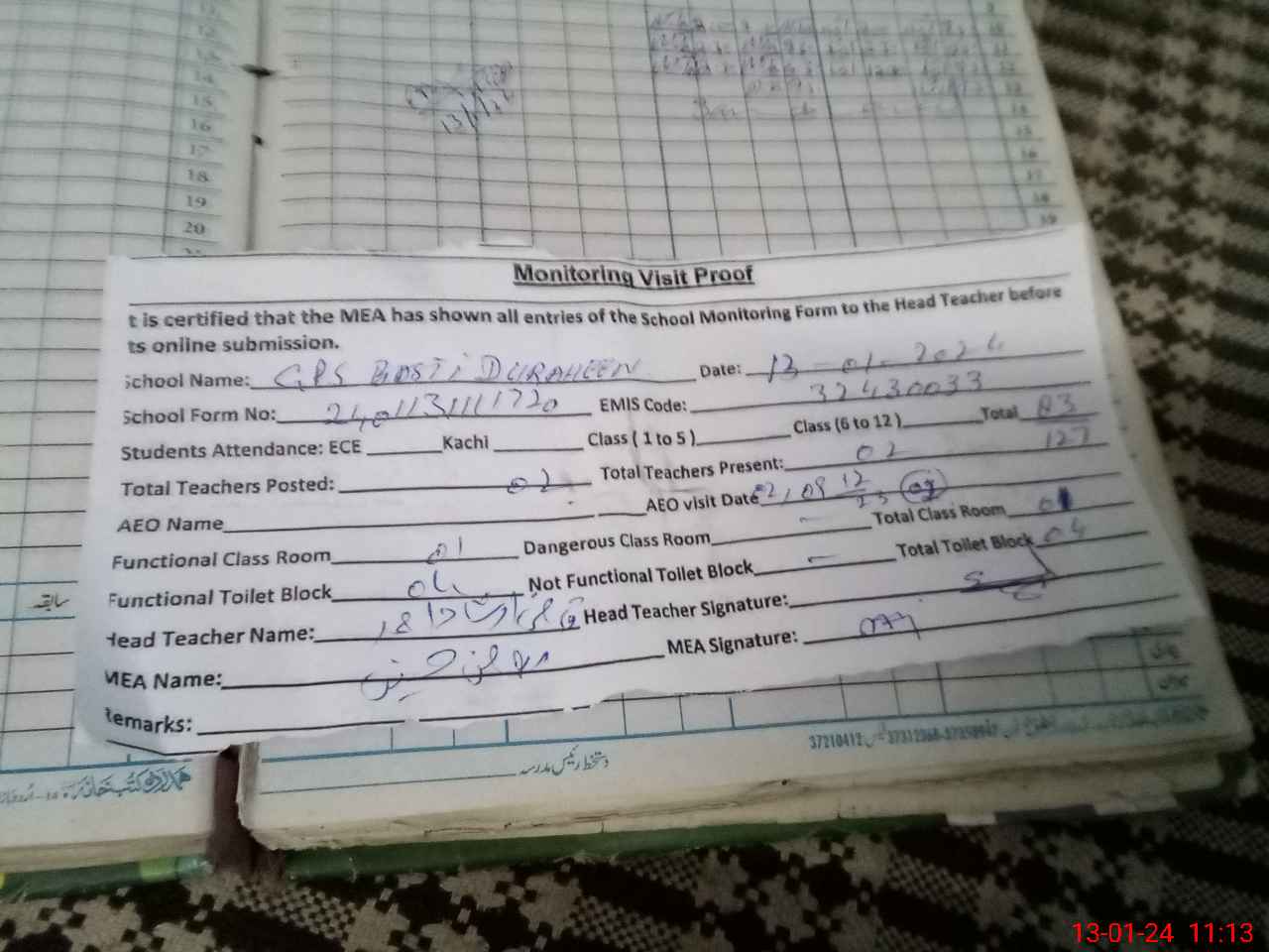 | Attendance Register | Head Teacher | MEA with School | Visit Proof |