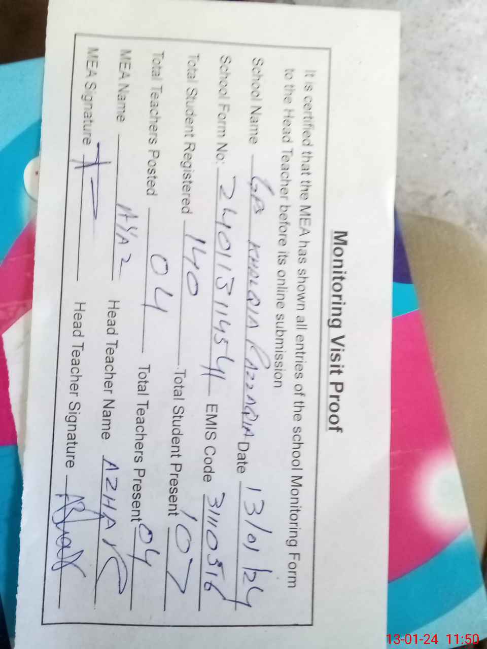 | Attendance Register | Head Teacher | MEA with School | Visit Proof |