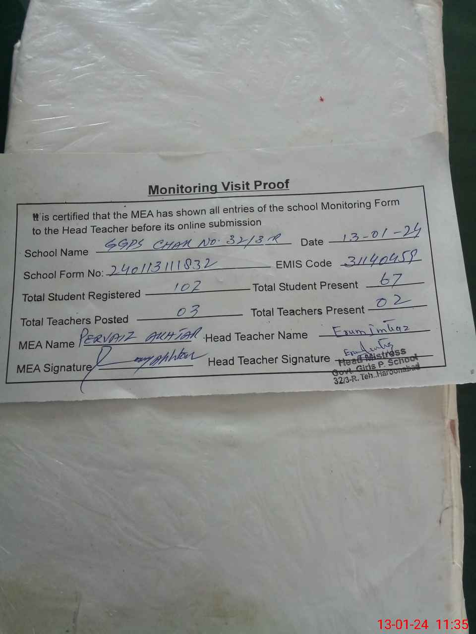 | Attendance Register | Head Teacher | MEA with School | Visit Proof |