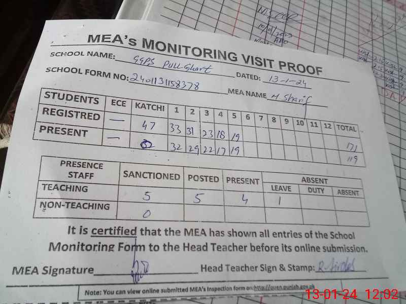 | Attendance Register | Head Teacher | MEA with School | Visit Proof |