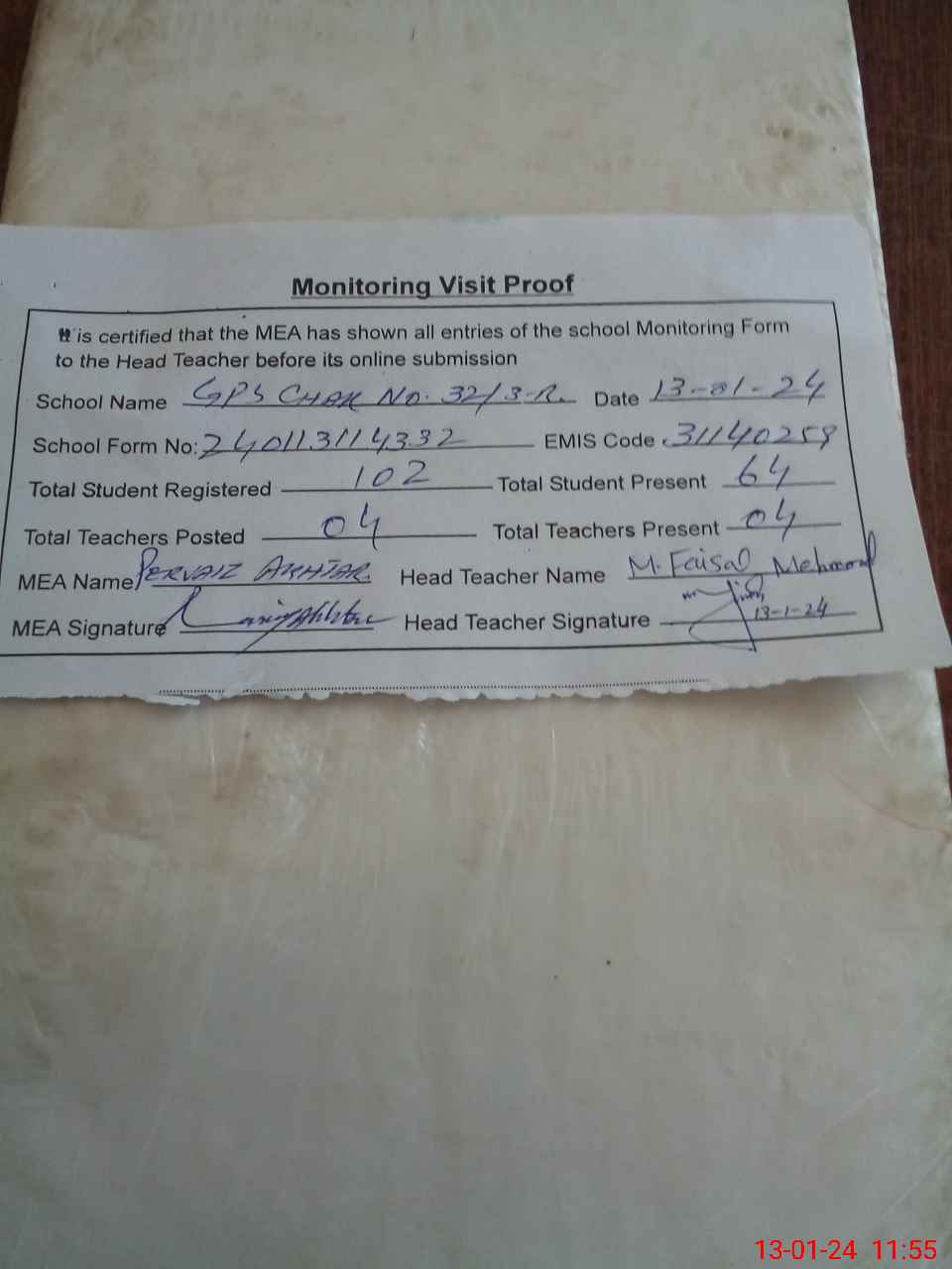 | Attendance Register | Head Teacher | MEA with School | Visit Proof |