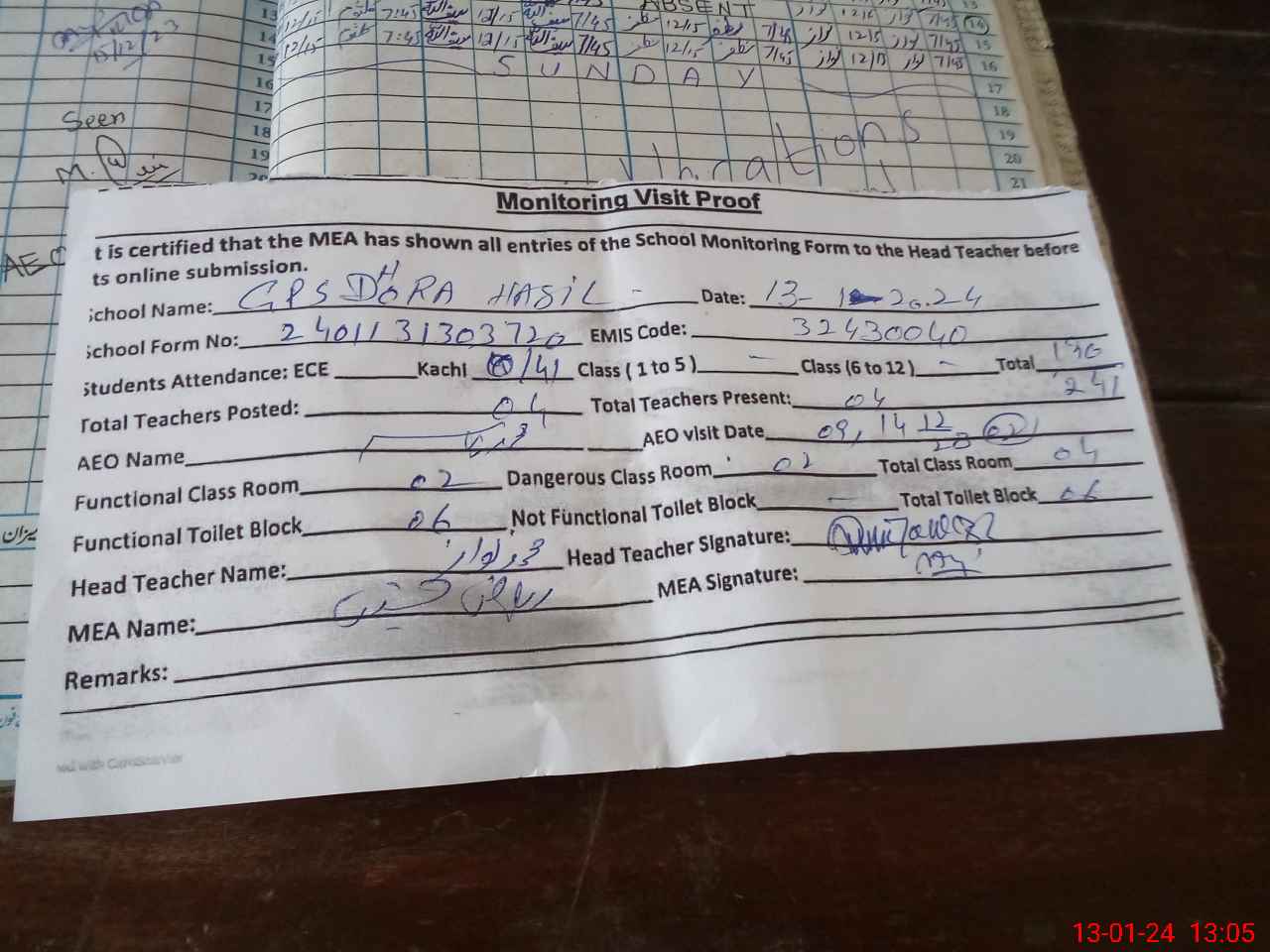 | Attendance Register | Head Teacher | MEA with School | Visit Proof |