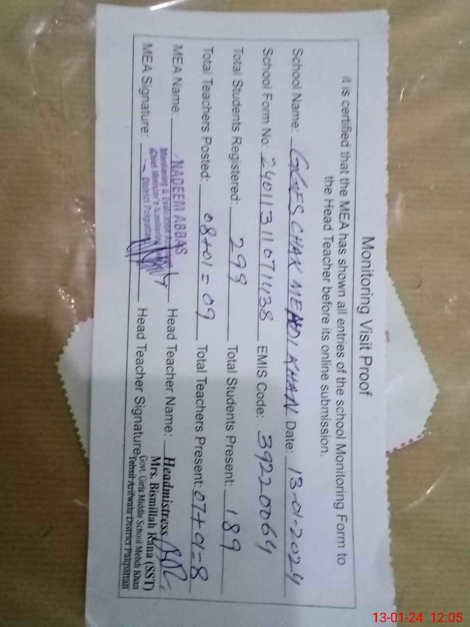 | Attendance Register | Head Teacher | MEA with School | Visit Proof |
