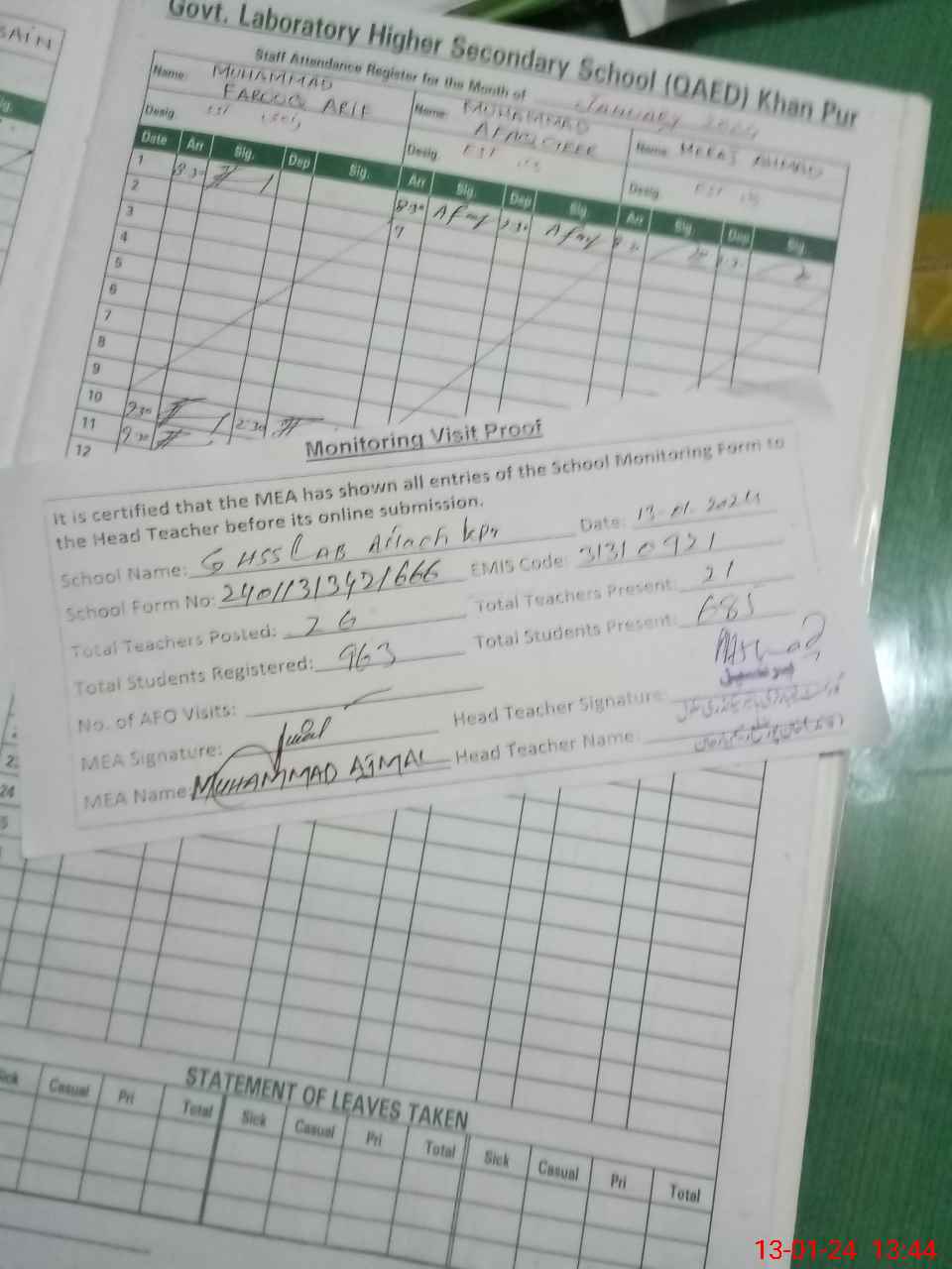| Attendance Register | Head Teacher | MEA with School | Visit Proof |