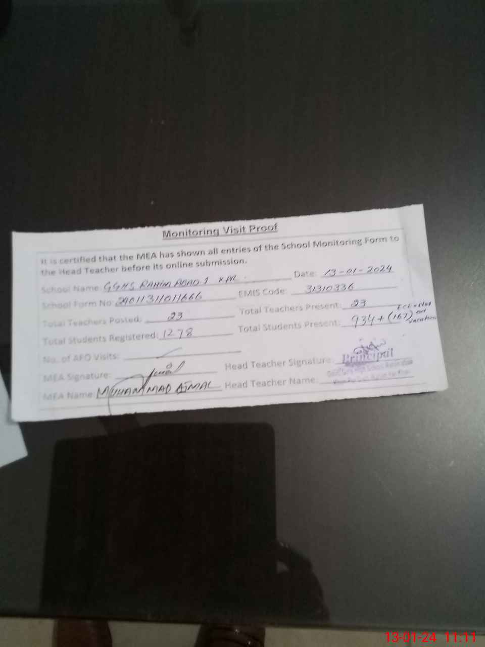 | Attendance Register | Head Teacher | MEA with School | Visit Proof |