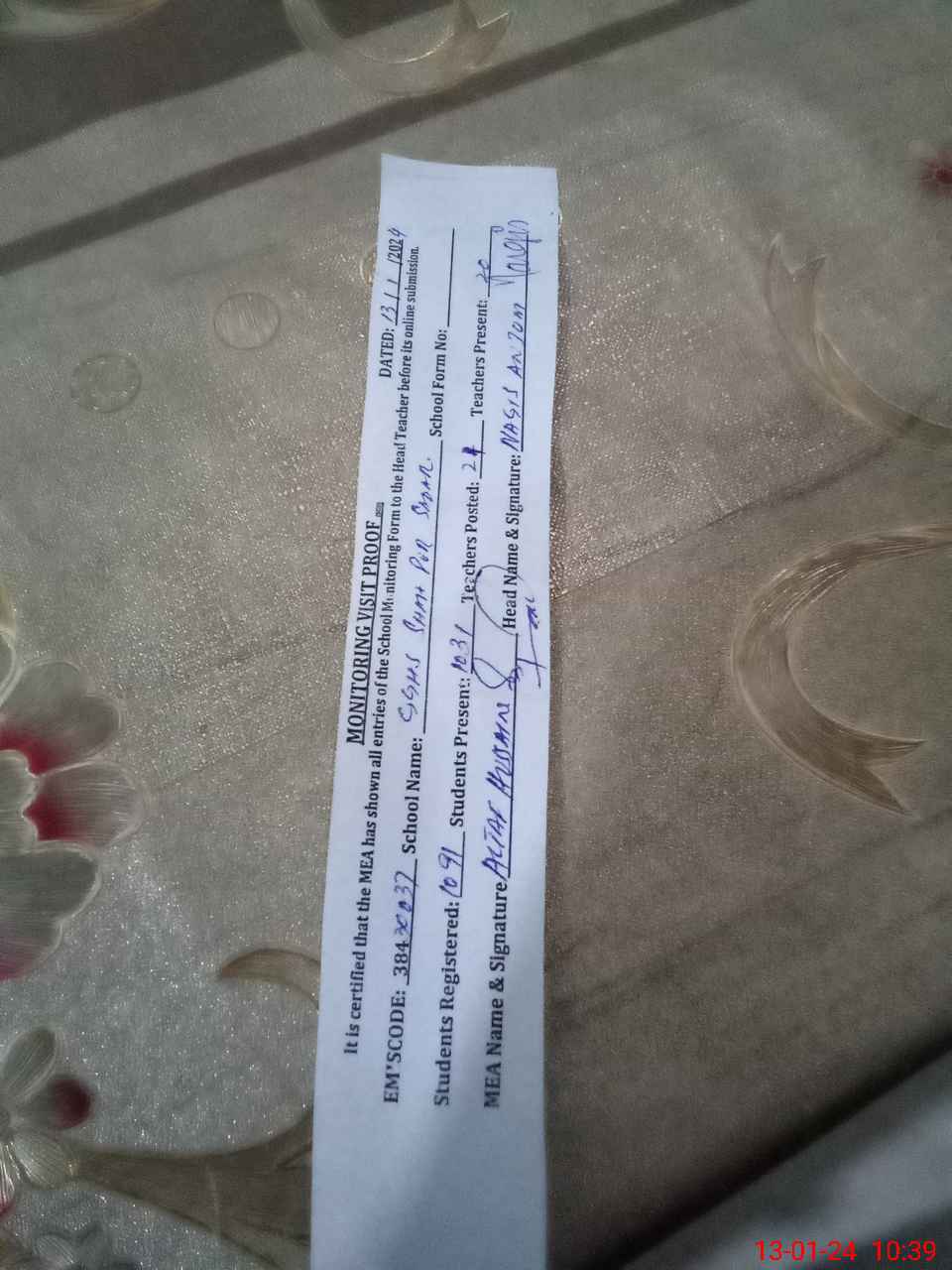 | Attendance Register | Head Teacher | MEA with School | Visit Proof |
