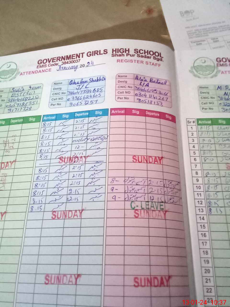 | CNIC | Full Name | Designation | R/C | Absence during last cal. month |