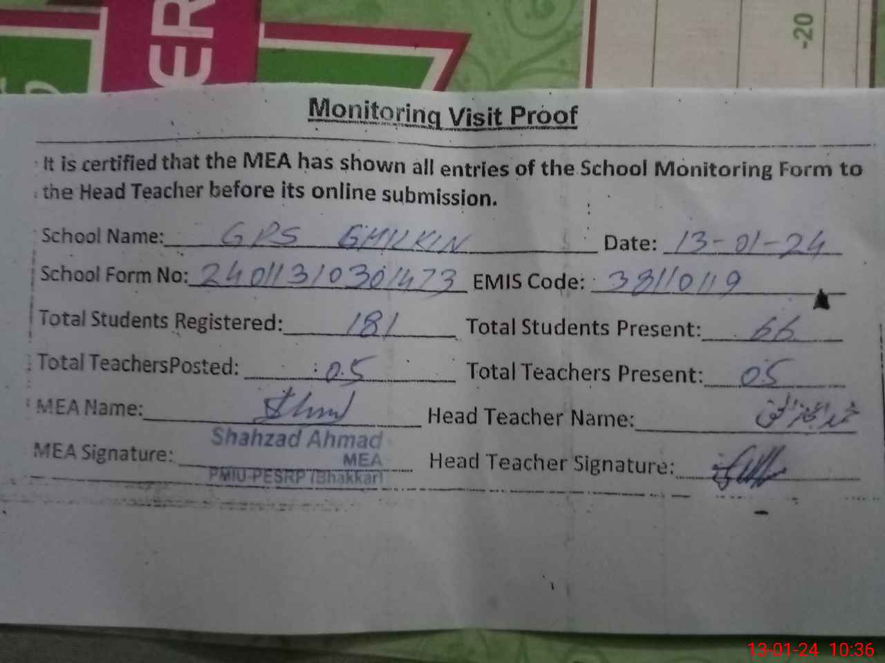 | Attendance Register | Head Teacher | MEA with School | Visit Proof |