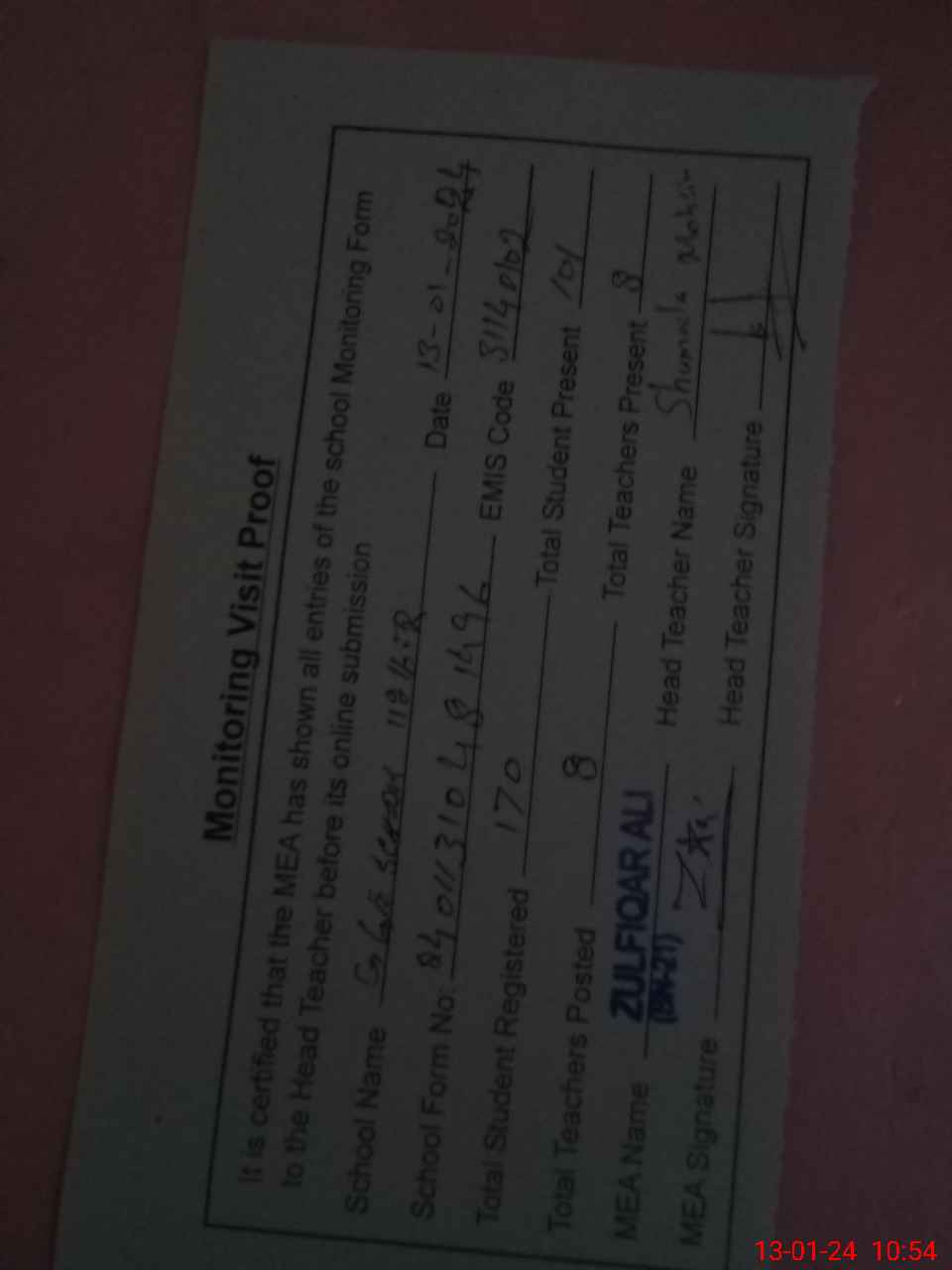 | Attendance Register | Head Teacher | MEA with School | Visit Proof |
