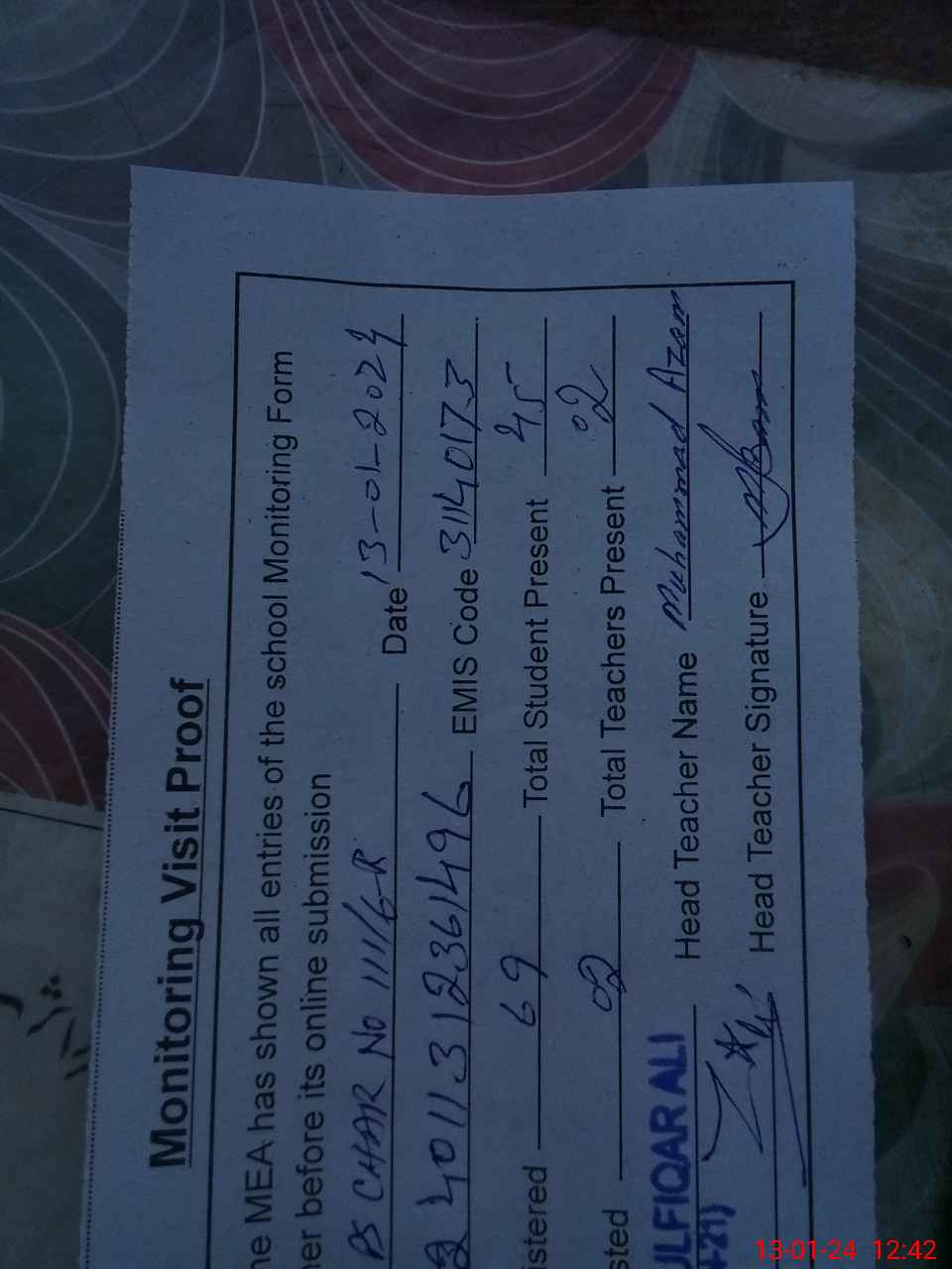 | Name: Mu**** Az**** Designation: (School Headmaster's/Headmistress's) PST Phone/Cell Number: 03**** |