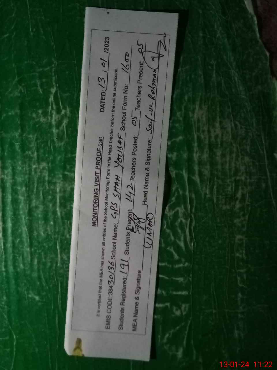 | Attendance Register | Head Teacher | MEA with School | Visit Proof |