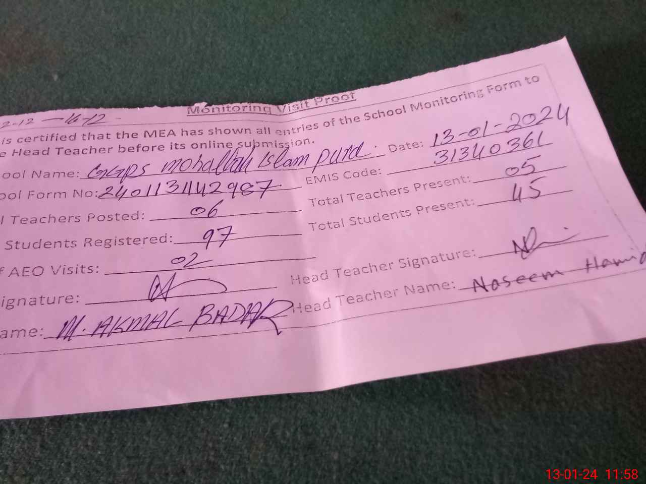 | Attendance Register | Head Teacher | MEA with School | Visit Proof |