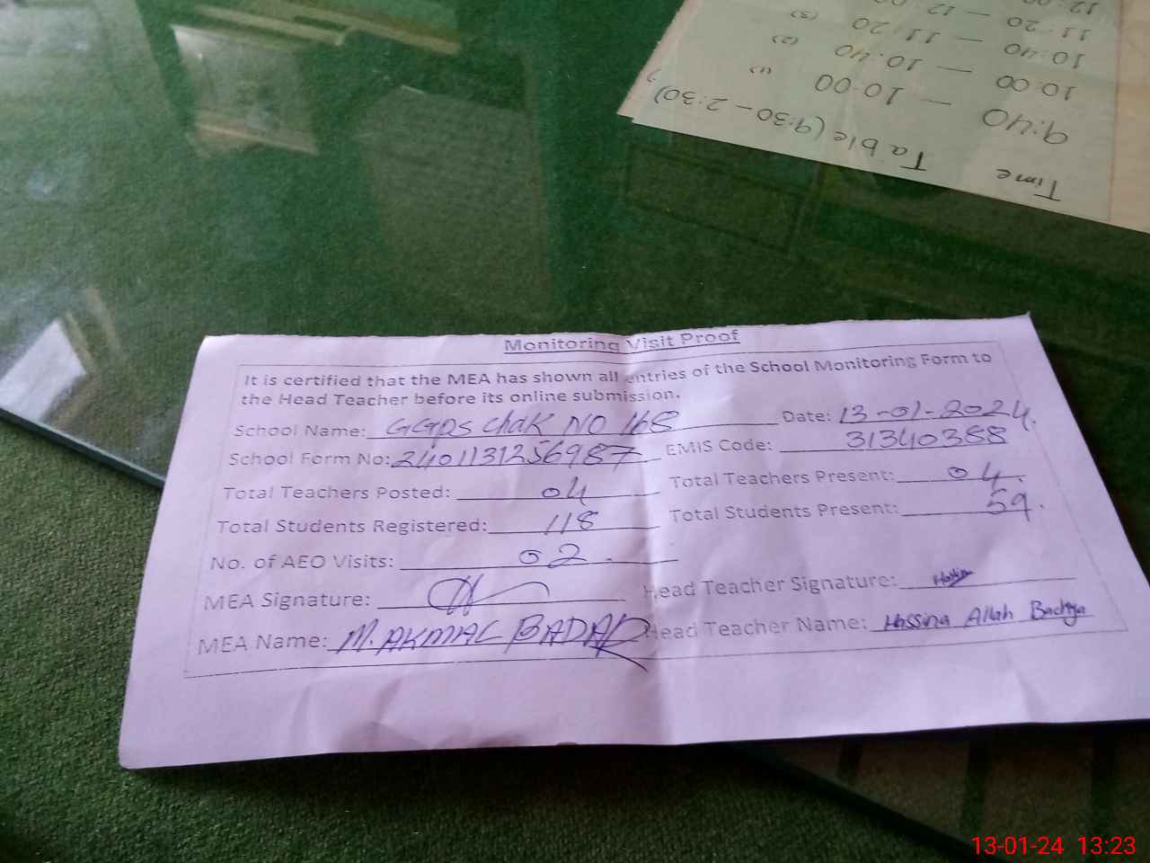 | Attendance Register | Head Teacher | MEA with School | Visit Proof |