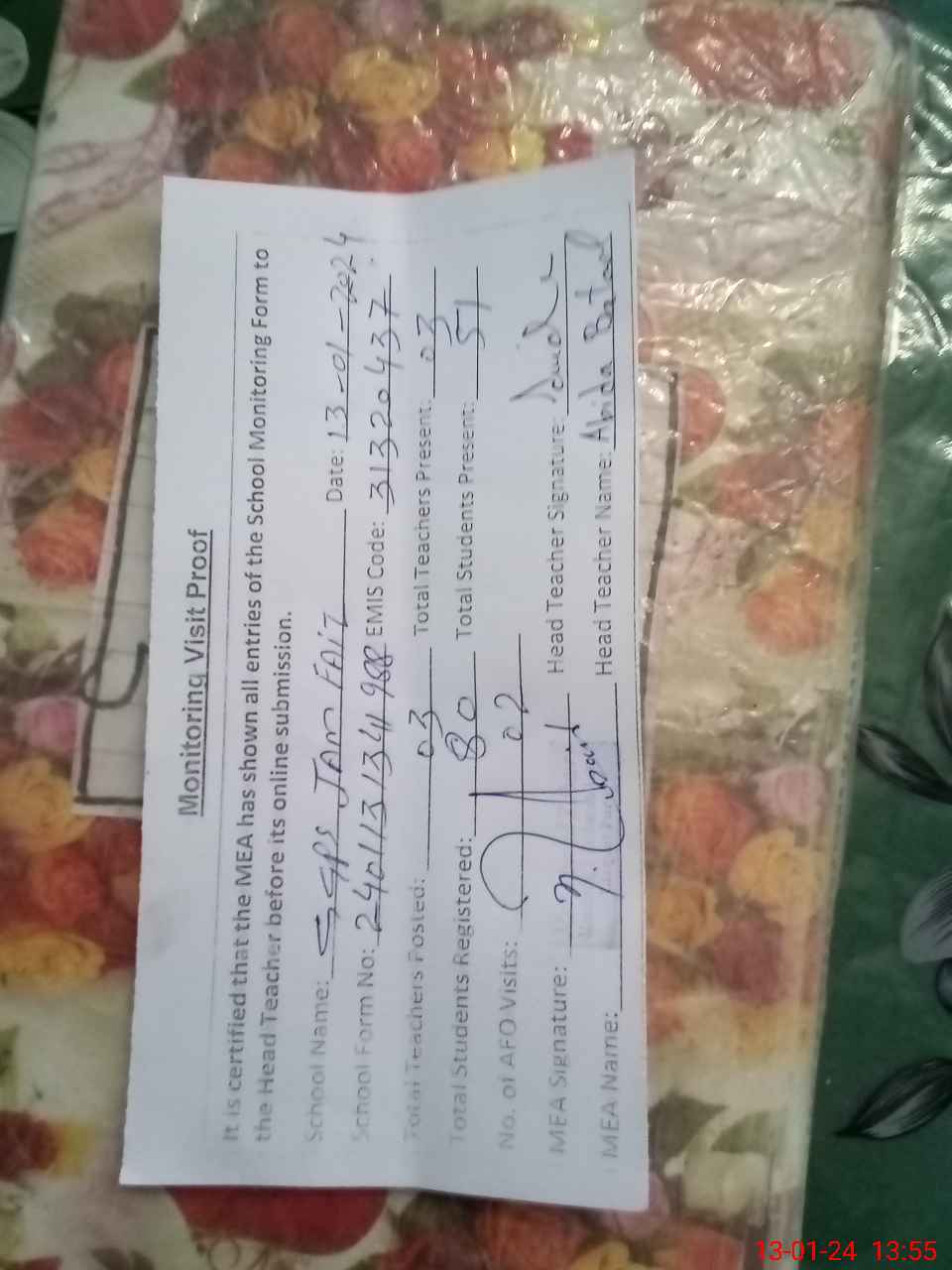 | Attendance Register | Head Teacher | MEA with School | Visit Proof |