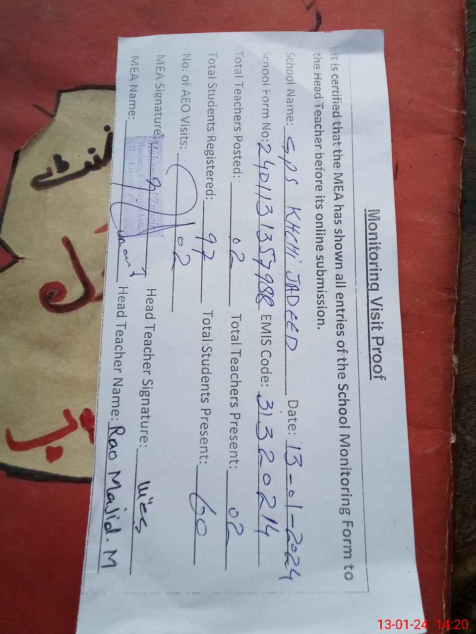 | Attendance Register | Head Teacher | MEA with School | Visit Proof |