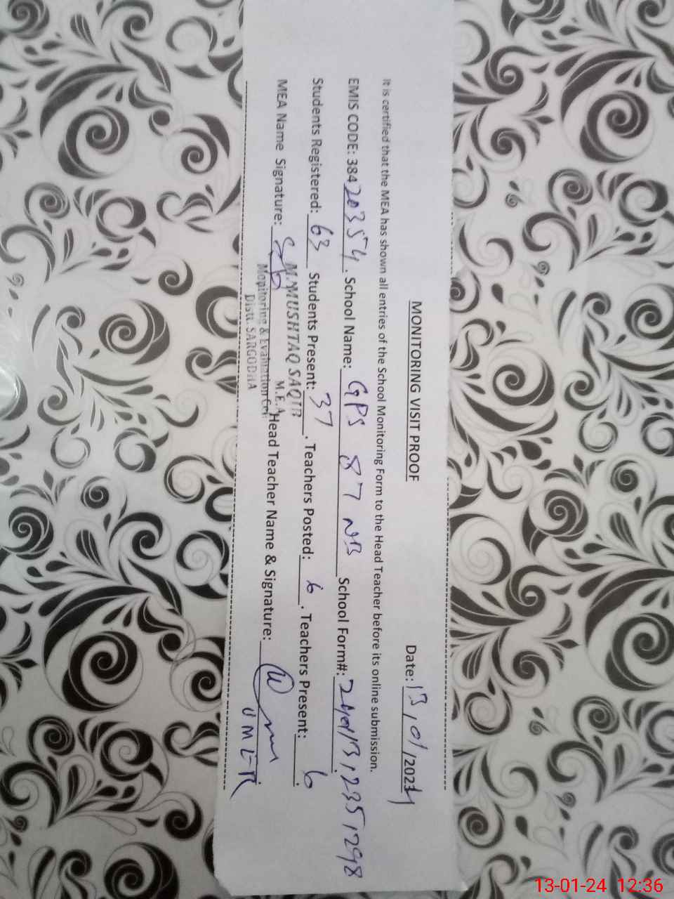 | Attendance Register | Head Teacher | MEA with School | Visit Proof |