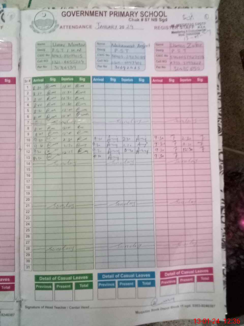 | CNIC | Full Name | Designation | R/C | Absence During Last Calender Month |
