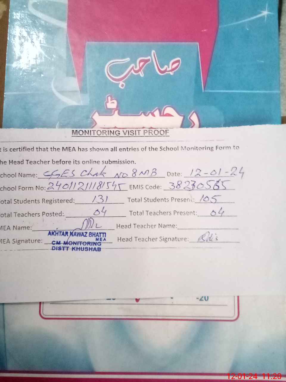 | Attendance Register | Head Teacher | MEA with School | Visit Proof |