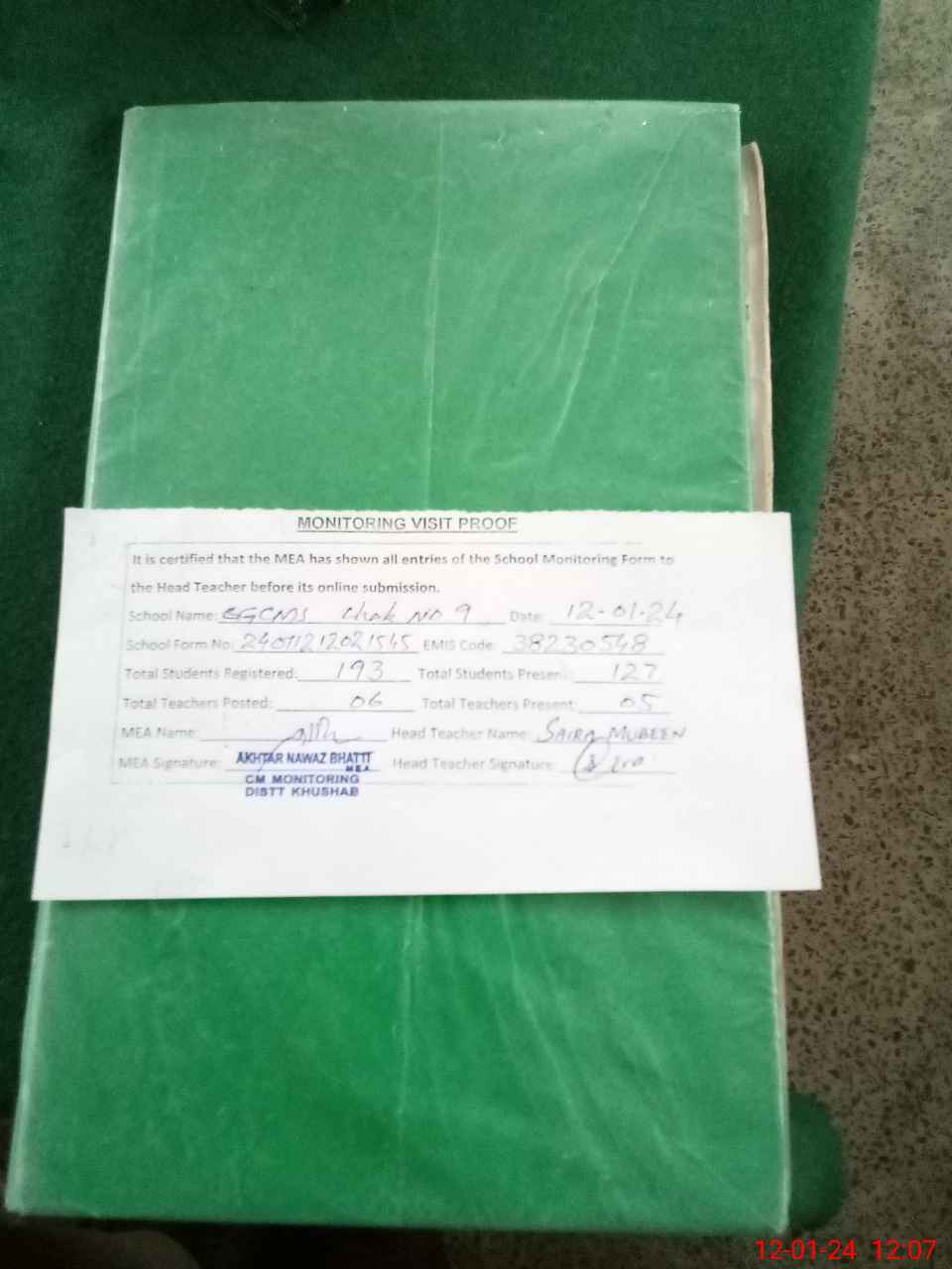 | Attendance Register | Head Teacher | MEA with School | Visit Proof |