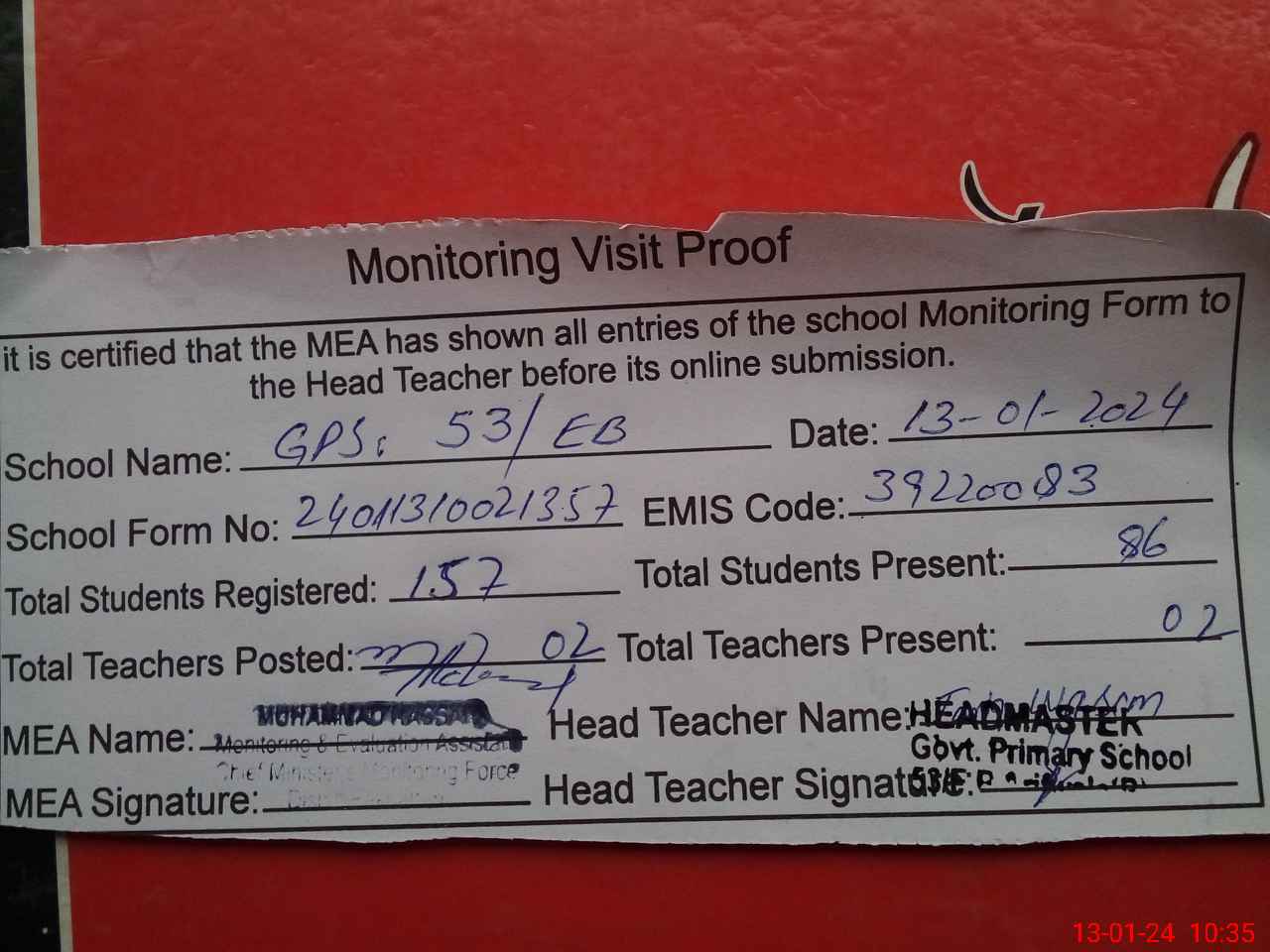 | Attendance Register | Head Teacher | MEA with School | Visit Proof |