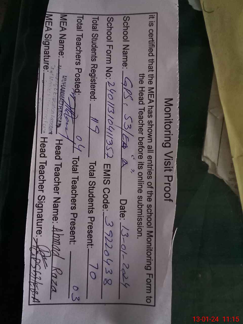 | Attendance Register | Head Teacher | MEA with School | Visit Proof |