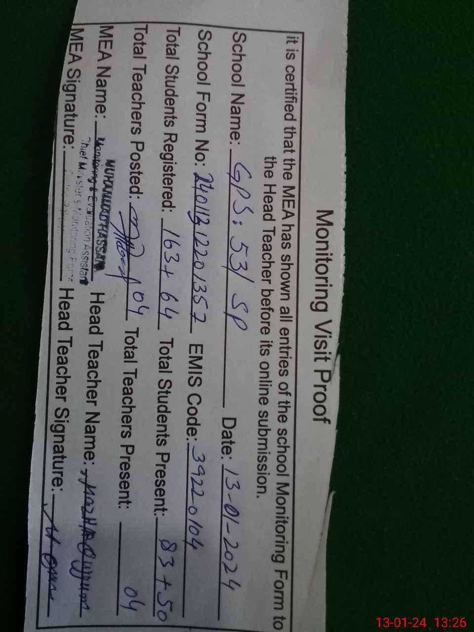 | Attendance Register | Head Teacher | MEA with School | Visit Proof |