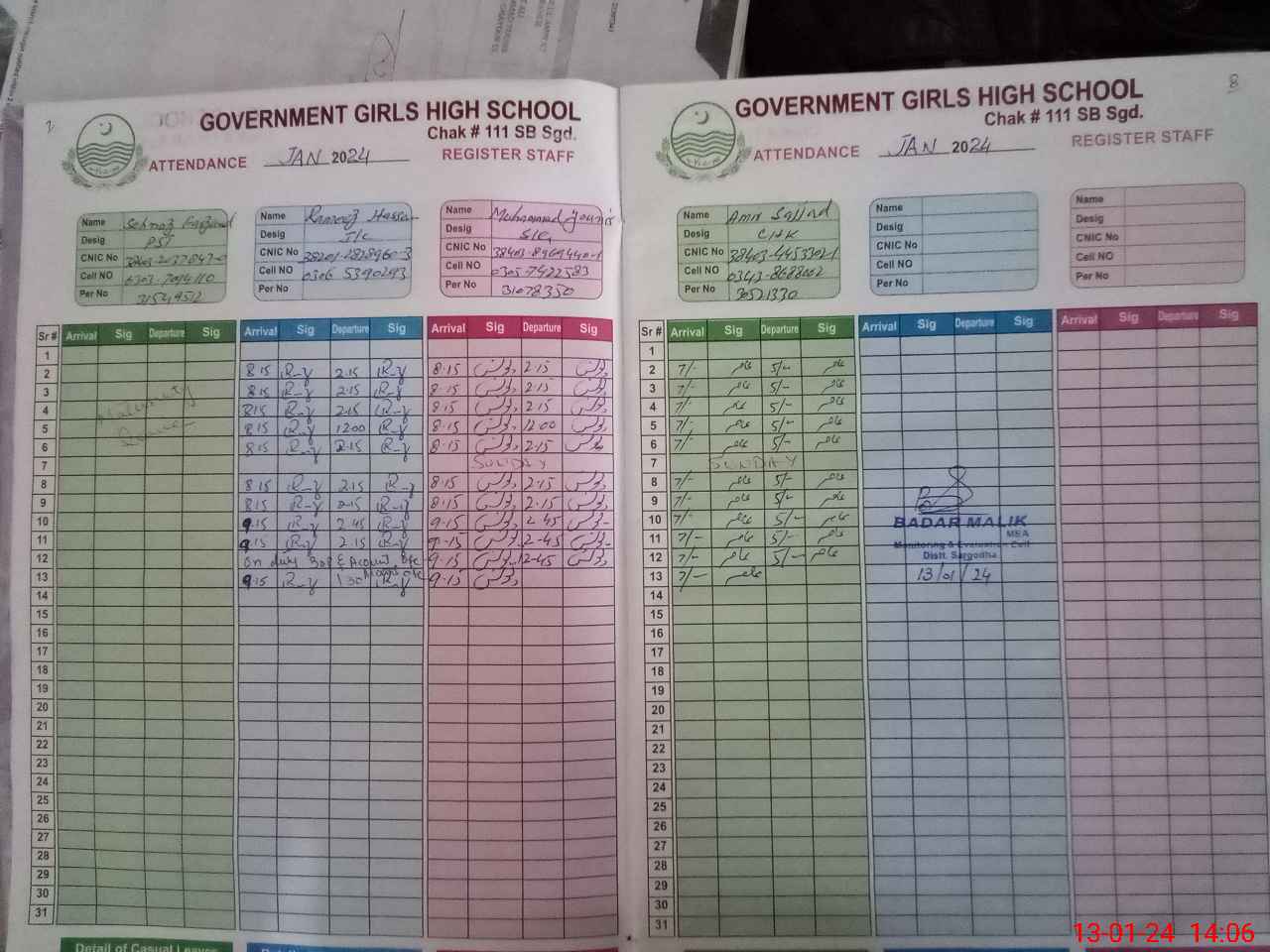 | Remarks (Use Separate Page if Required): Teacher Hina Basharat is on temporary duty since 26 Nov2023 | |||||
