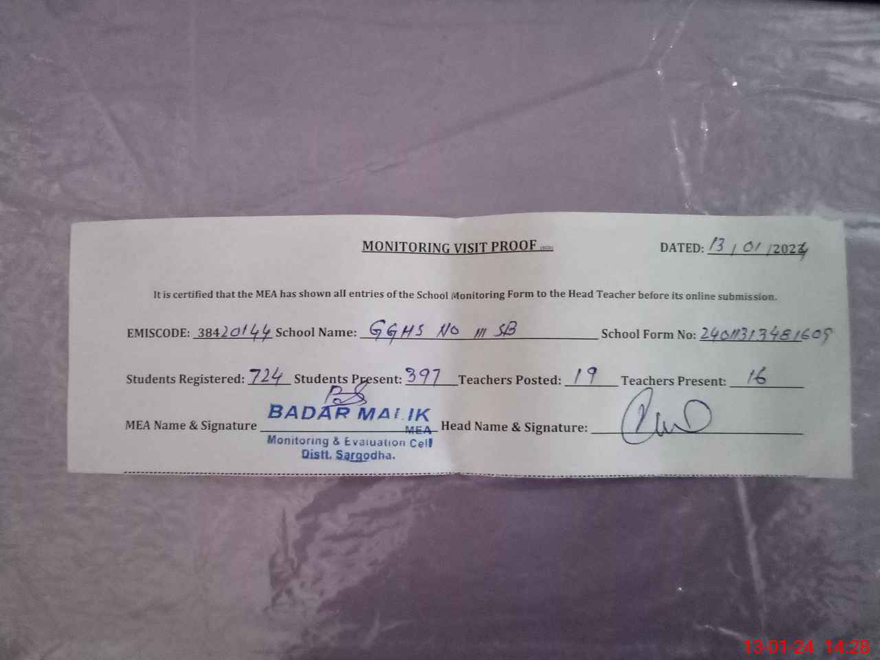 | Attendance Register | Head Teacher | MEA with School | Visit Proof |