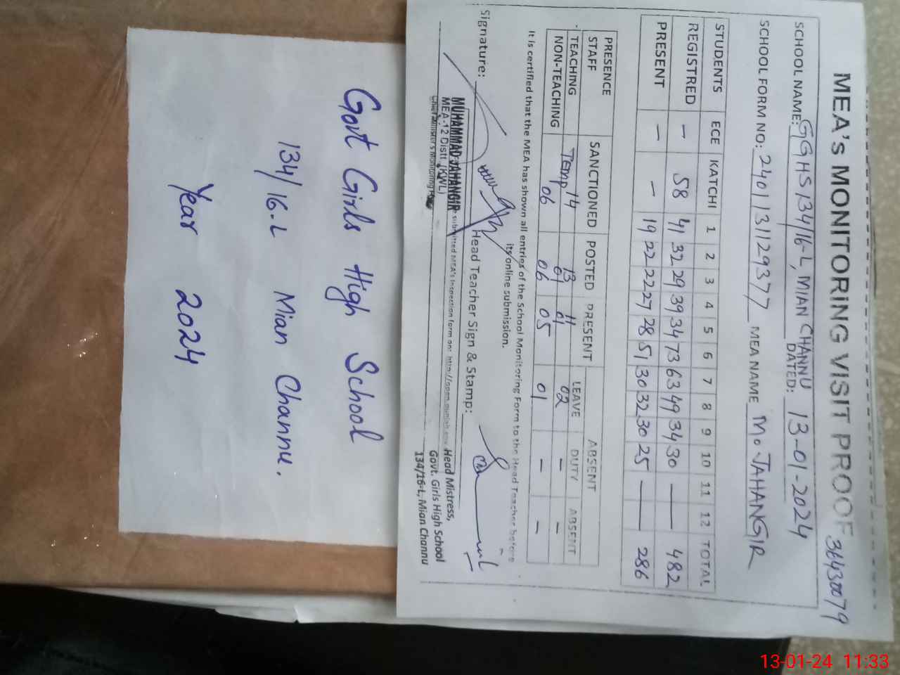 | EMIS Code: 36430079 | Name of School: GGHS 134/16-L, MIAN CHANNU | |||